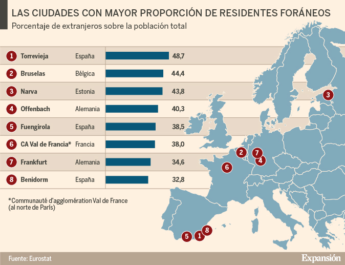 Почти половина (46,7%) жителей валенсийского города Торревьеха (Torrevieja) составляют иностранные граждане, согласно данным Евростата. Это самый высокий показатель среди городов ЕС. Для сравнения, в среднем для Испании доля иностранцев составляет 12,7%.