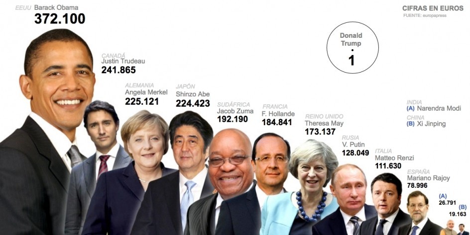 Если Трамп выполнит своё обещание, то мировой рейтинг самых больших зарплат среди глав государств, составленный американским телеканалом CNN, возглавит канадский премьер Джастин Tрюдо с 241.865 евро ($ 260 тыс.). Канцлер Германии Ангел Меркель с 225,121 евро ($ 242тыс.) и премьер - министр Японии Синдзо Абэ с 224,423 евро ($241,250 тыс.) вошли в тройку лидеров рейтинга.