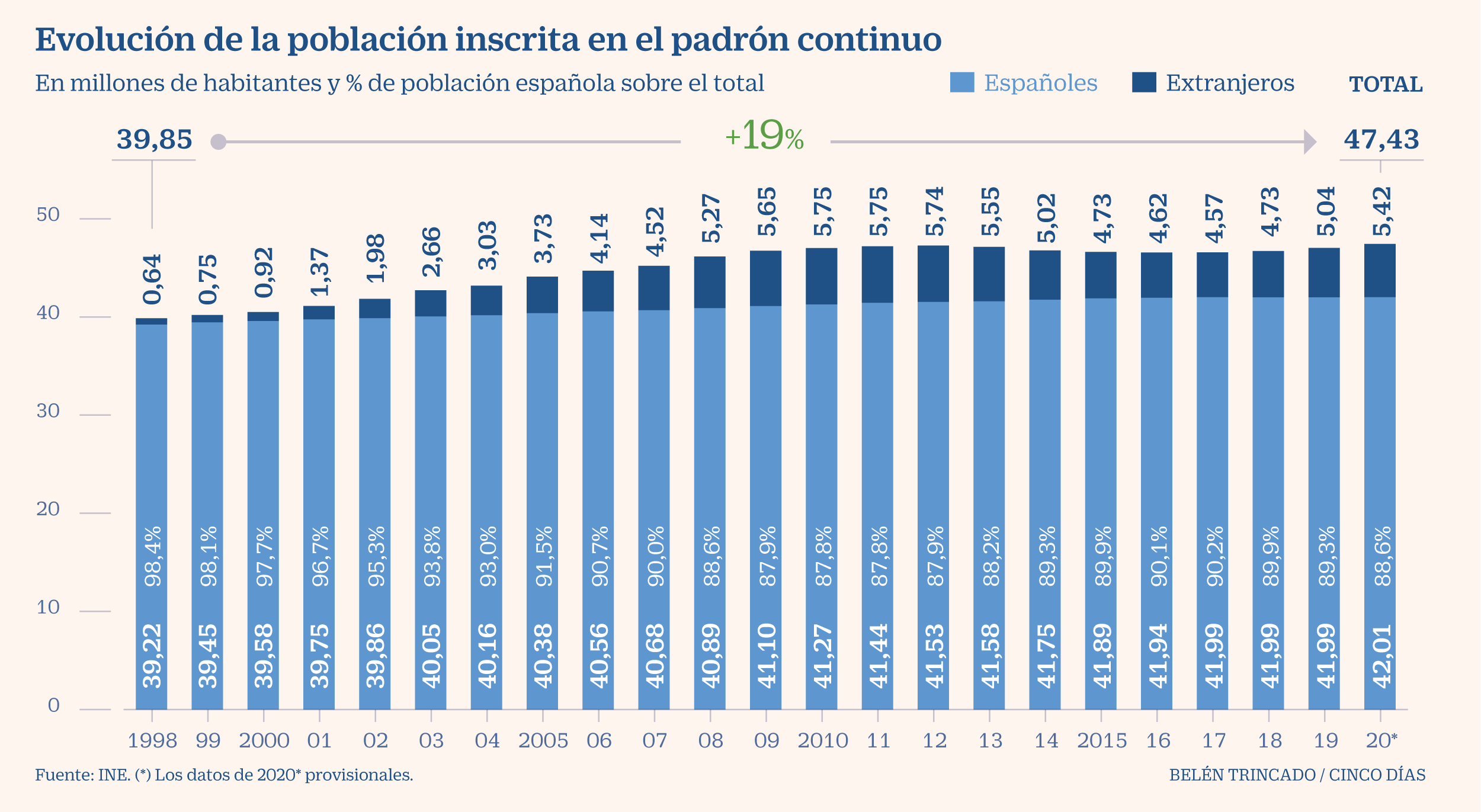 Из общего количества лиц, зарегистрированных в качестве постоянно проживающих на территории королевства, 42.008.058 (88,6%) – граждане Испании, а 5.423.198 (11,4%) – иностранные резиденты. В течение 2019 года, число граждан, имеющих испанский паспорт, увеличилось на 18.728 человек (+0,04%), а рост числа иностранцев составил 386.320 человек (+ 7,7%).