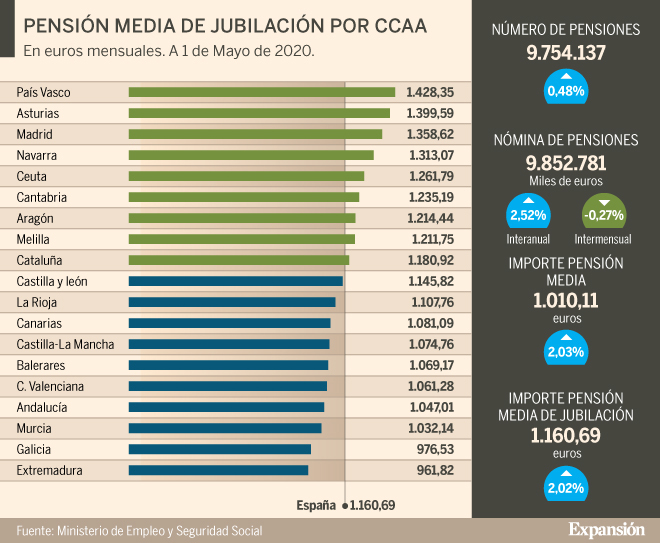 Фонд социального обеспечение Испании (Seguridad Social) выделил в мае текущего года на выплату пенсий в размере 9.852,8 млн. евро, что на 2,52% больше, чем за тот же месяц 2019 года, но на 0,27% меньше, чем в предыдущем месяце, согласно данным, опубликованным Министерством труда, миграции и социального обеспечения.