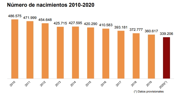 Согласно предварительным данным, опубликованным сегодня Национальным институтом статистики (INE) в 2020 году в Испании, было зарегистрировано в общей сложности 339.206 рождений детей, что на 21.411 рождений меньше или на 5,94% меньше, чем в предыдущем году. Кроме того, по сравнению с 2010 годом рождаемость снизилась на 30,3%.