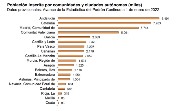 Численность зарегистрированного (прописанного) населения Испании увеличилась на 50.490 человек или на 0,11% в течение 2021 года, и достигло 47.435.597 жителей (на 1 января 2022 года), согласно предварительным данным, опубликованным Национальным институтом статистики (INE).
