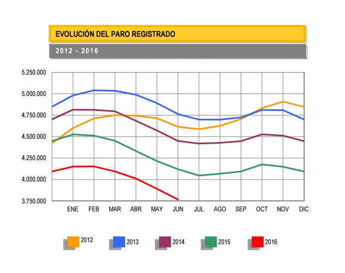 Число безработных, зарегистрированных в офисах государственных служб занятости Испании, в первый летний месяц 2016 года, по сравнению с маем, уменьшилось на 124.349 человек или на 3,20%, что является вторым лучшим показателем для этого месяца в исторической серии наблюдений, начатой в 1996 году, уступая лишь в июню 2013 года, когда безработица снизилась более чем 127.000 человек.