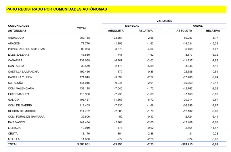 Все регионы показали снижение безработицы, особенно это коснулось Андалусии (- 23.651 человек), Галисии (- 11.863), Каталонии (- 9.044) и Валенсии (-7.545). На другом полюсе находятся Наварра (-52) и Ла-Риоха (-176).