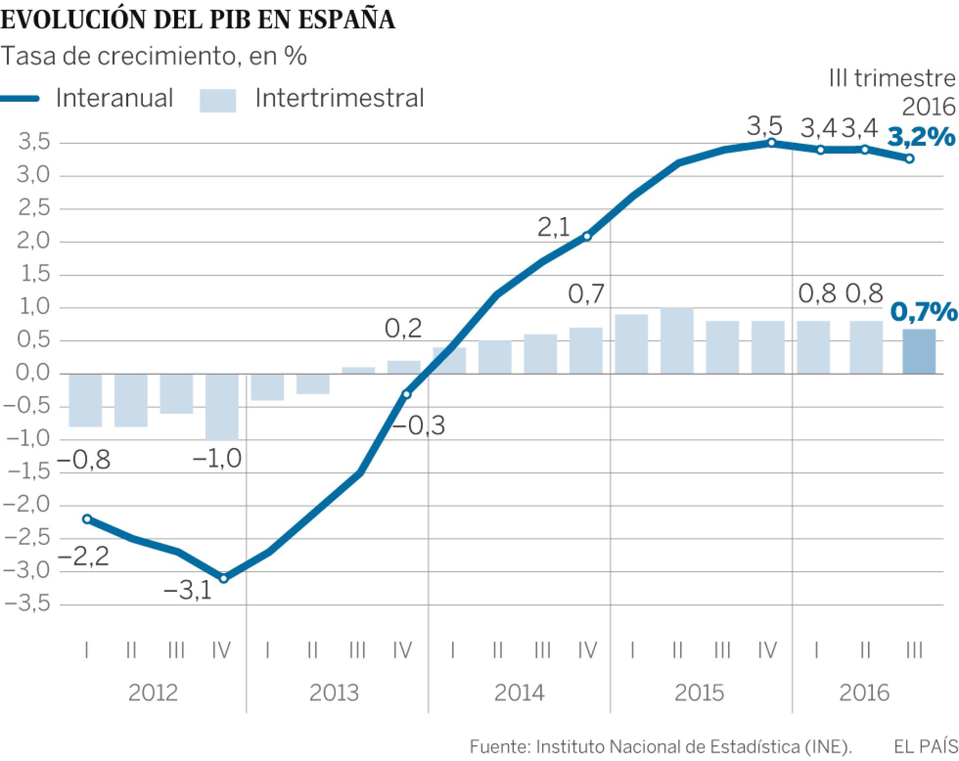 В III квартале 2016 года ВВП Испании вырос на 0,7% по сравнению со вторым кварталом текущего года, и эта положительная динамика продолжается 12 кварталов подряд, согласно предварительным данным опубликованным в минувшую пятницу Национальным институтом статистики.