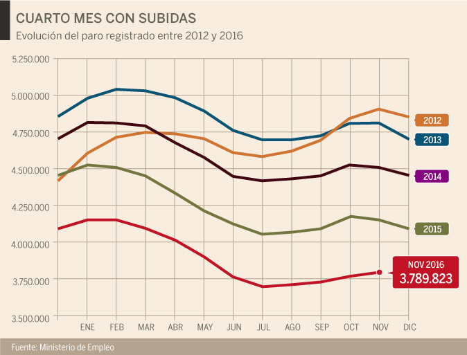 Рынок труда в Испании четвёртый месяц подряд показывает пусть незначительный, но рост числа людей, не имеющих работу, согласно ноябрьским данным по безработице, представленным сегодня Министерством занятости и социальной защиты (Ministerio de Empleo y Seguridad Social).