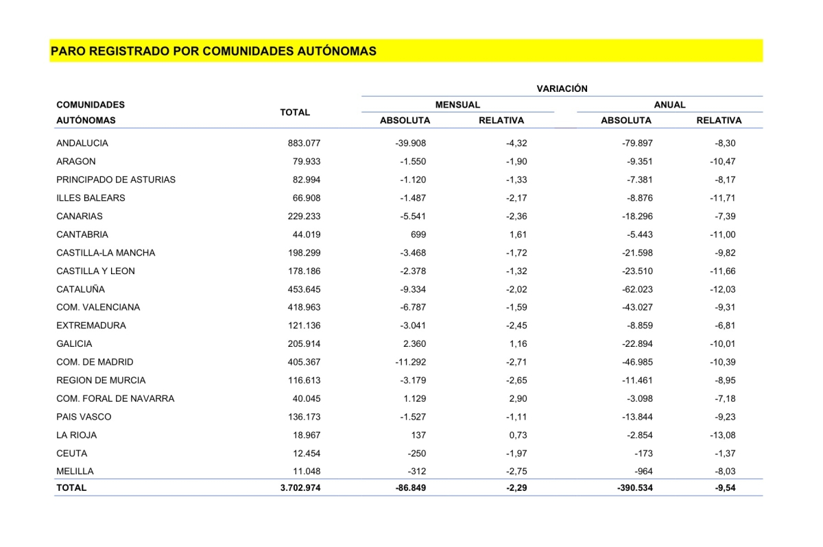 Среди 13 испанских регионов, где в декабре произошло снижение безработицы, лидерами являются Андалусия (-39.908), Мадрид (-11.298), Каталония (-9.334) и Валенсия (6.787). Напротив безработица повысилась в 4 автономиях, в том числе в Галисии (+2.360 безработных), Наварре (+1.129).