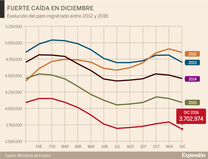 Сегодня количество людей, зарегистрированных в офисах государственных служб занятости (oficinas de los servicios públicos de empleo) на первый день января уменьшилось на 86.849 человек (-2,29%), по сравнению с предыдущим месяцем и составило в общей сложности 3.702.974 безработных. Этот показатель является самым низким за последние семь лет.