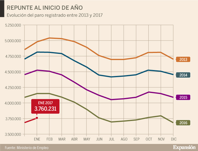 По итогам января 2017 года число безработных, официально зарегистрированных в органах государственной службы занятости Испании, составило 3.760.231 человек, что на 57 257 или на 1,5% больше, по сравнению с предыдущим месяцем. Министерство труда и социального обеспечения Испании, опубликовавшее эти данные, отмечает, что основными причинами негативных изменений на рынке труда явилось окончание рождественской кампании и сезона сбора оливок.