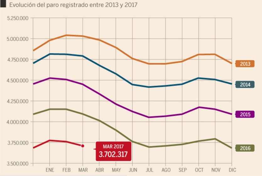 По итогам марта 2017 года число безработных, официально зарегистрированных в органах государственной службы занятости Испании, составило 3.702.317 человек, что на 48.559 человек или на 1,3% меньше, по сравнению с предыдущим месяцем.