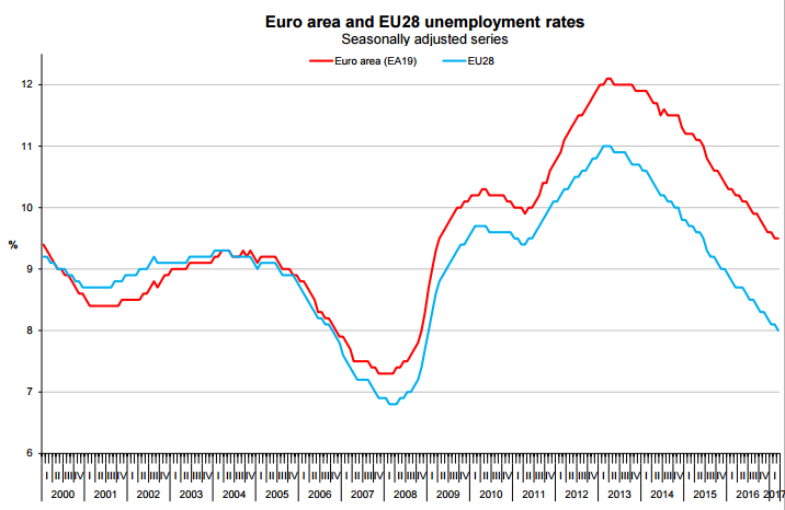 Уровень безработицы в 19-ти странах зоны евро (EA19) в марте 2017 года составил 9,5%, что является минимальным значением с апреля 2009 года, согласно данным, опубликованным Статистическим управлением Европейского союза (Eurostat). Год назад этот показатель составлял 10,2%,
