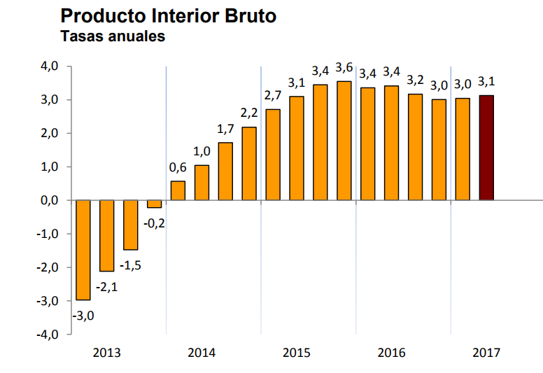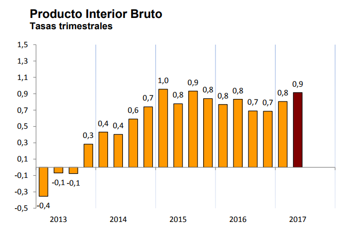 Испанская экономика выросла на 0,9% в период с апреля по июнь 2017 года, одна десятую больше, чем в предыдущем квартале, согласно предварительным данным, опубликованным Национальным институтом статистики (INE). Годовой рост ВВП составил 3,1%, что на одну десятую выше двух предыдущих кварталов, растущих со скоростью 3%. Указанный квартальный рост ВВП на 0,9% совпадает с оценкой, сделанной Банком Испании и прогнозом министр экономики Луисом де Гиндосом.