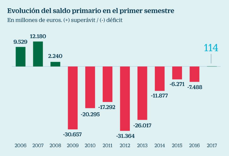 Испания закончила первую половину текущего года с первичным профицитом бюджета в размере 114 млн. евро. И хотя это значение составляет только 0,01% от ВВП, символично, что этот результат был достигнут впервые с 2008 года. Годом ранее первичный дефицит достиг значения в 7,5 млрд. евро, а в предыдущие кризисные годы полугодовой показатель достигал рекордных величин более 30 млрд.