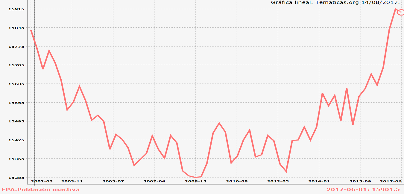 Данные второго квартала 2017 года, полученные в ходе Опроса экономически активного населения, (EPA) свидетельствуют о том, что в Испании почти 16 млн. (15.901.500) неактивных граждан, то есть людей возрастом 16 лет и старше, которые не работают и не занимаются поисками работы. И хотя этот показатель уменьшилась на 13.200 человек по сравнению с предыдущим кварталом, но, в тоже время за последний год их стало больше на 300 тыс. (+1,74%), что является максимальным показателем для 2 квартала с 1984 года.