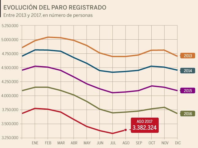 Количество безработных, зарегистрированных в офисах государственных служб занятости Испании на конец августа, увеличилось на 46.400 человек и составило в общей сложности 3.382.324 человека. Это был первый рост после шести месяцев последовательного падения. Однако Министерство отмечает, что показатель безработицы имеет самую низкую величину для этого месяца за последние восемь лет. В период кризиса число людей, зарегистрированных на бирже труда, превышало пять миллионов с максимальным значением в феврале 2013 года – 5.040.222 безработных.