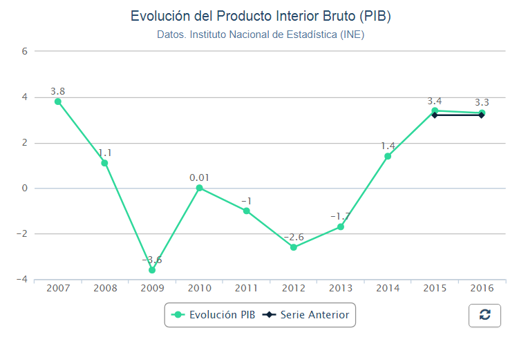 Национальный институт статистики Испании (INE), по мере поступления новых данных, пересмотрел данные о росте экономики страны за 2015 и 2016 год, которые оказались выше, чем это было представлено ранее. Так в 2015 году ВВП пиренейского королевства фактически вырос на 0,2% больше и составил 3,4%. То же происходит и с 2016 годом, когда экономика Испании выросла на 3,3%, что на 0,1% больше изначально зафиксированной величины.