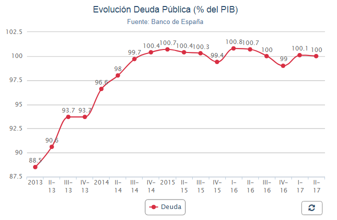 Задолженность всех государственных администраций Испании во втором квартале 2017 года увеличился на 8,890 млрд. евро по сравнению с предыдущим кварталом, достигнув рекордной величины в 1,139 триллиона евро. Этот показатель составляет 100% ВВП, что на одну десятую меньше, чем в первом квартале, согласно последним данным Банка Испании. В годовом исчислении государственный долг увеличился на 31,88 млрд. или на 2,9%.