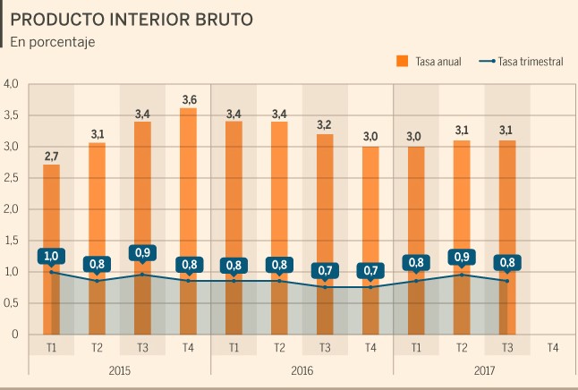 Испанская экономика выросла на 0,8% в третьем квартале 2017 года, что на одну десятую меньше, чем в предыдущем квартале, в основном, из-за стагнации во внешнеторговой деятельности. Такие данные были приведены вчера Национальным институтом статистики (INE).