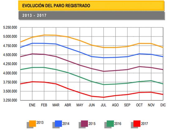 Количество безработных, зарегистрированных в офисах государственных служб занятости (oficinas de los servicios públicos de empleo) Испании на конец декабря 2017 года, сократилась на 61.500 человек, по сравнению с предыдущим месяцем и составило в общей сложности 3.412.781 безработных. Министерство занятости и социальной защиты (Ministerio de Empleo y Seguridad Social), представившее эти данные, подчеркивает, что этот показатель является самым низким за последние восемь лет. В период кризиса число людей, зарегистрированных на бирже труда, превышало пять миллионов с максимальным значением в феврале 2013 года – 5.040.222 безработных.