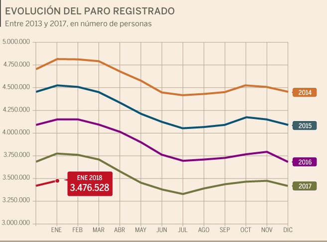 По итогам января 2018 года число безработных, официально зарегистрированных в органах государственной службы занятости Испании, составило 3 476 528 человек, что на 63 747 больше, по сравнению с предыдущим месяцем. Министерство труда и социального обеспечения Испании, опубликовавшее эти данные, отмечает, что основными причинами негативных изменений на рынке труда явилось окончание рождественской кампании.
