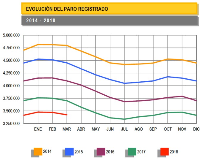 По итогам марта 2018 года число безработных, официально зарегистрированных в органах государственной службы занятости Испании, составило 3.422.551 человек, что на 47.697 человек или на 1,37% меньше, по сравнению с предыдущим месяцем. Таким образом, показатель безработицы находится на самом низком уровне за последние 9 лет.