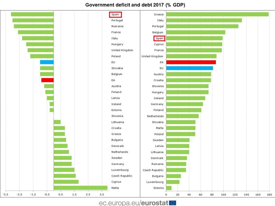 Согласно информации, предоставленной правительством Испании, дефицит бюджета на 2017 год составлял 3,07% ВВП без учета средств помощи банкам и 3,11%, если помощь учитывалась. Планы правительства предполагают сокращение дефицита до 2,2% в 2018 году, до 1,3% в 2019 и до 0,5% в 2020 году.