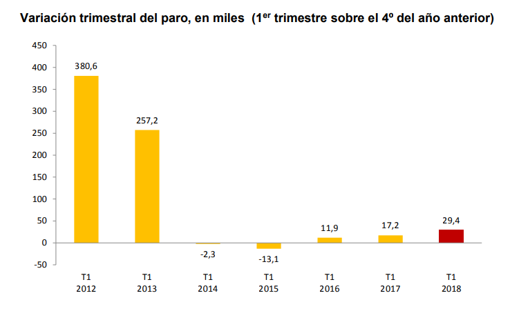 Рост безработицы, зарегистрированный в первом квартале, является самым высоким за этот период с 2013 года, когда безработица выросла более чем на 257 200 человек. В первых кварталах 2016 и 2017 годов отмечалось увеличение безработицы на 11.900 человек и 17.200 человек, соответственно, тогда как в 2014 и 2015 годах было сокращение безработицы на 2.300 и 13.100 человек.