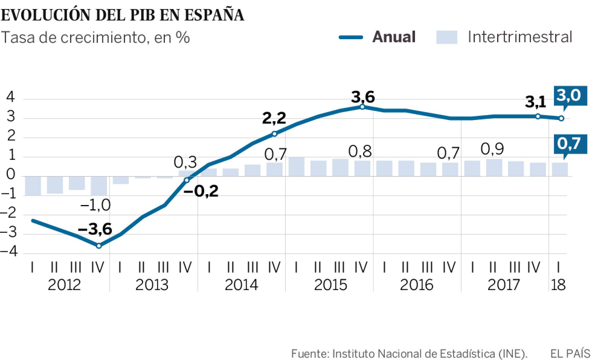 Испанская экономика выросла на 0,7% в первом квартале 2018 года, сохраняя тот же темп, что и в предыдущем квартале, согласно окончательным данным Ежеквартальных национальных счетов, опубликованным 31 мая Национальным институтом статистики (INE). В годовом выражении ВВП королевства вырос на 3,0%, что на одну десятую больше, чем было указано в предварительных данных INE, опубликованных 27 апреля.