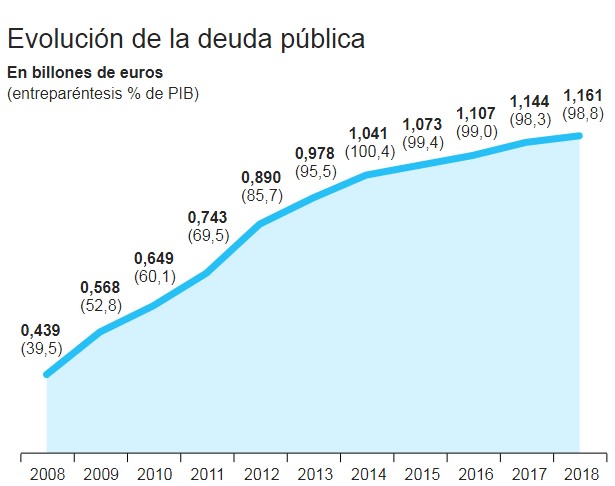Задолженность всех государственных администраций Испании в первом квартале 2018 года составила рекордные €1.161 млрд. или 98,8% ВВП, что на 0,5% больше, чем в конце 2017 года (98,3% ВВП), согласно данным, опубликованным вчера Банком Испании. В то же время, относительно первого квартала прошлого года показатель госдолга уменьшился на 0,5% (99,7% ВВП).
