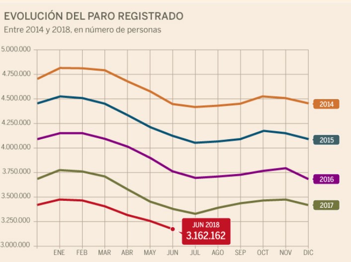 По итогам июня 2018 года число безработных, официально зарегистрированных в органах государственной службы занятости Испании, составило 3.162.162 человек, что на 89.968 человек меньше, по сравнению с предыдущим месяцем.