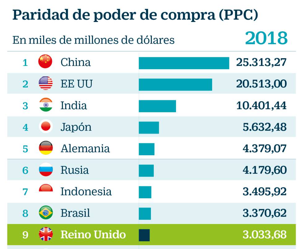 Наиболее заметным, в свою очередь, будет падение Соединенного Королевства, где прогнозируется застой экономики в 2019 году, что совпадает с официальным началом выхода из Европейского Союза , запланированного на март. Brexit обусловит падение страны с пятого на седьмое место уже в наступающем году, и ее экономика в течение пяти лет будет уступать Франции и Индии.