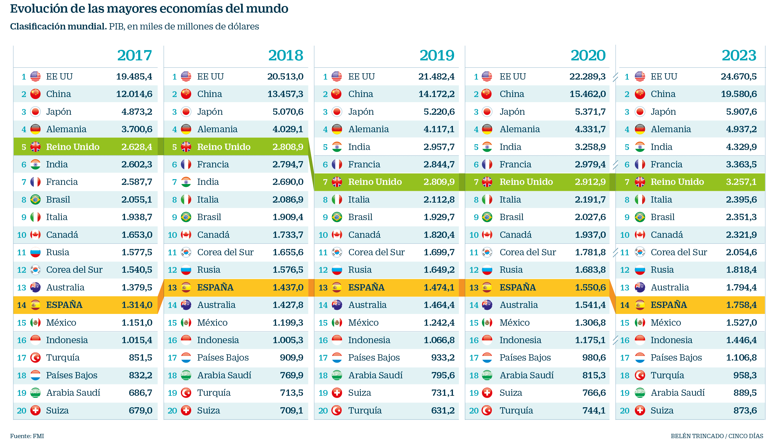 Однако МВФ не ожидает изменений на первых четырех позициях в рейтинге в течение следующих пяти лет. США будут продолжать лидировать, увеличив ВВП с 19.485 млрд. долларов в 2017 году до 24.670 млрд. - в 2023 году. Китай будет сокращать разницу с первым местом, с12.014 млрд. до 19.580 млрд. Третье место будет удерживаться Японией в течение всего периода, а четвертое - останется за Германией.