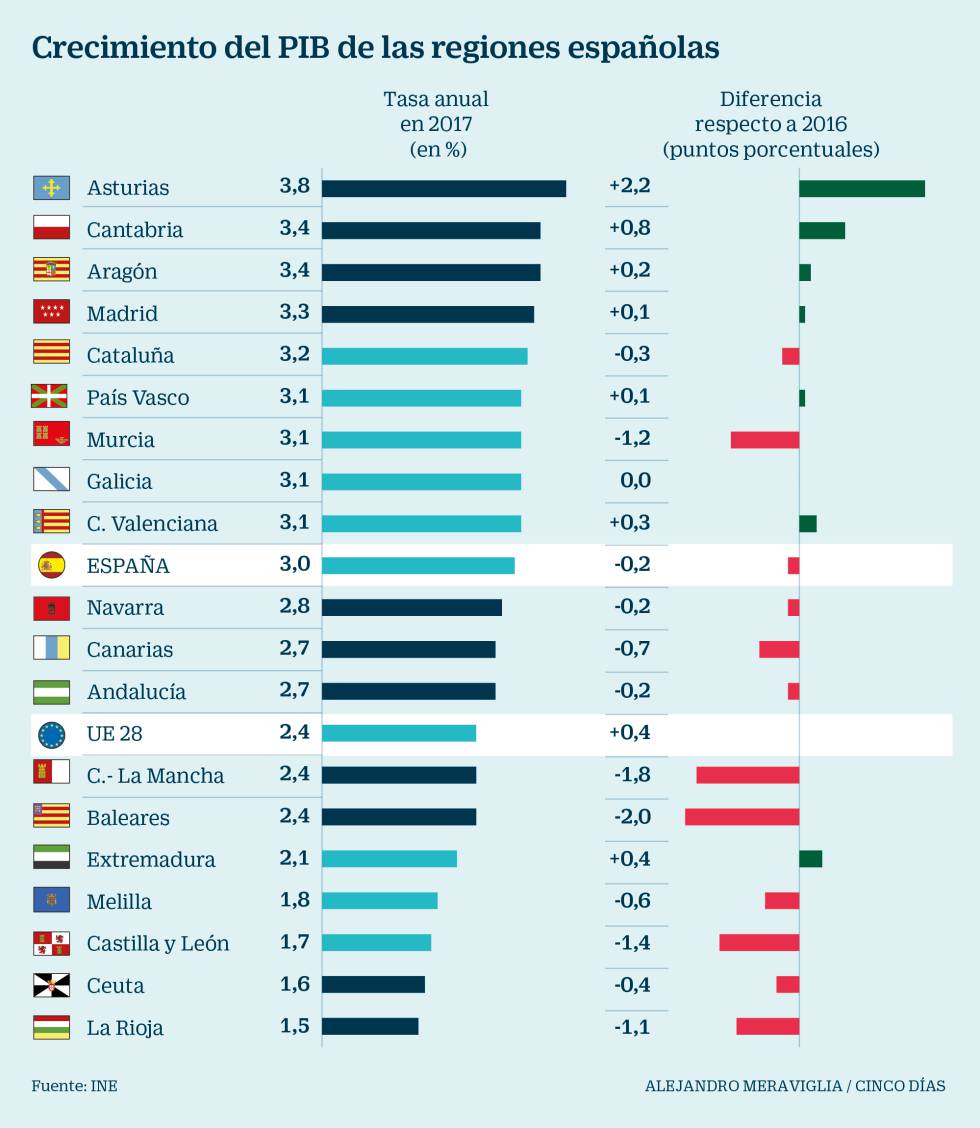 На противоположной стороне находится Мадрид, который вырос на 7% по сравнению с 2008 годом. Это все еще второй регион с самым высоким ВВП, и к 2015 году он уже восстановил докризисные уровни. Мурсия также превышает ВВП 2008 года на 5,4%, Балеарские острова - на 5,1% ,Страна Басков (3,5%), Наварра (3%), Каталонии (2,7%), Канарские острова (1,4%) и Галисия (1%). В Арагоне ВВП 2007 года остался на уровне 2008 года.