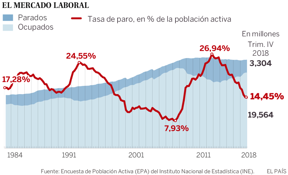 Прошедший 2018 год стал еще одним хорошим годом для рынка труда Испании. Об этом свидетельствуют данные по безработице IV квартала 2018 года, опубликованные сегодня Национальным институтом статистики (INE) согласно обследованию экономически активного населения (EPA).