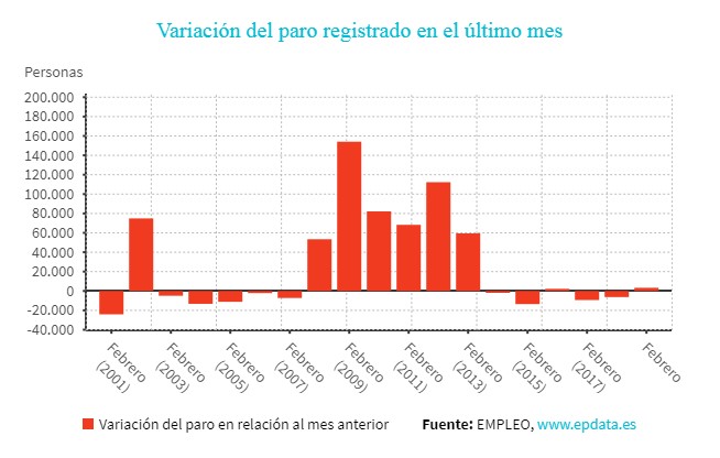 В рамках исторической серии, которая началась в 1996 году, безработица в феврале росла одиннадцать раз и снижалась - тринадцать. Увеличение, зарегистрированное в феврале этого года, контрастирует с падениями, зафиксированными в 2014 году (-1.949 безработных), 2015 году (-13.538 безработных) в 2017 году (-9.355 безработных) и 2018 году (-6.280 безработных). В промежутке между ними, в 2016 году, безработица увеличилась на 2.231 человек, что ниже уровня февраля текущего года.