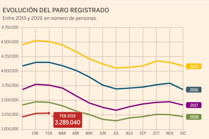 По итогам февраля 2019 года число безработных, официально зарегистрированных в органах государственной службы занятости Испании, составило 3 289.040 человек, что на 3.279 человек (0,1%) больше, по сравнению с предыдущим месяцем.