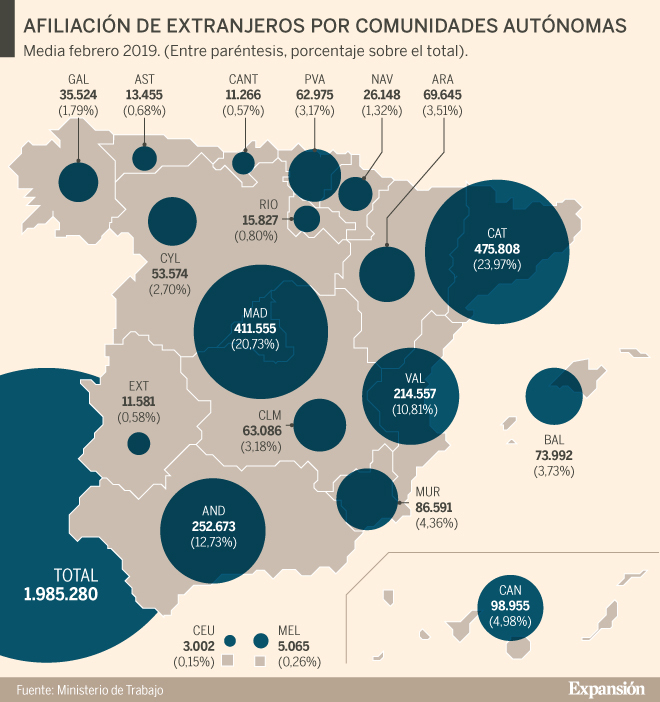 В феврале 2019 года число официально зарегистрированных иностранных работников в Испании (уплачивающих взносы в Seguridad Social), увеличилось на 18 581 человек, по сравнению с январём, и составило 1 985 280 человек, согласно данным, представленным Министерством труда, миграции и социальной защиты