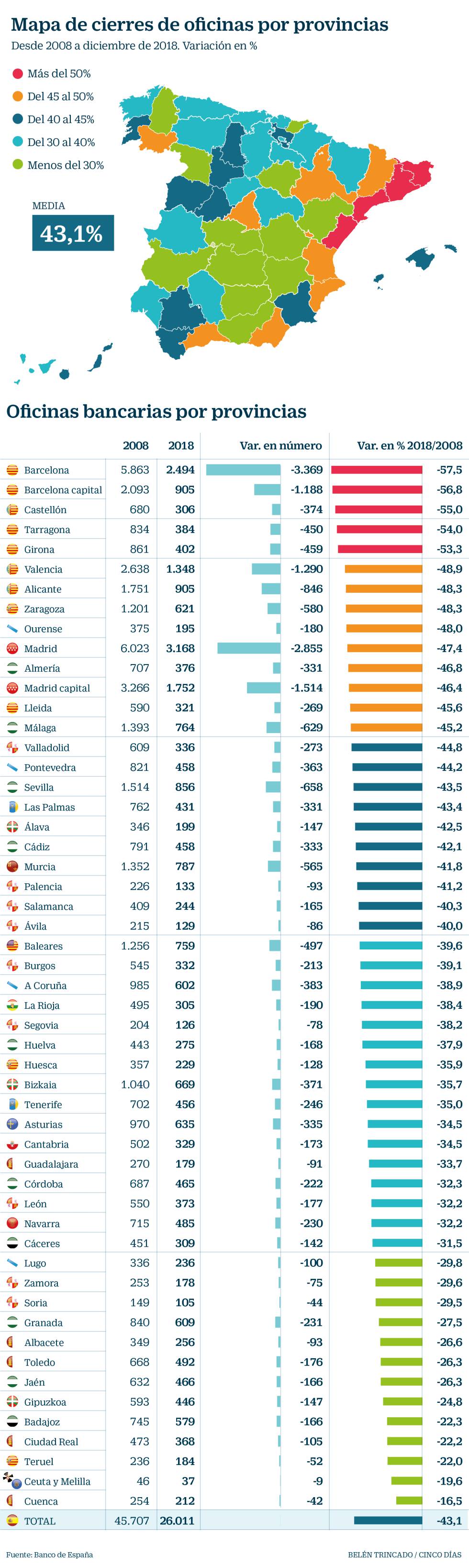 За этот период четыре провинции (Барселона, Кастельон, Таррагона и Жирона) потеряли более половины своих офисов. Другие восемь провинций (включая Мадрид, Валенсию и Сарагосу) потеряли более 45%. Корректировка была жестокой в городе Мадрид, где было потеряно более 1500 офисов, и в городе Барселона - около 1200.