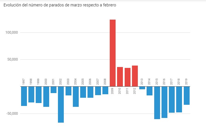Министерство труда и социального обеспечения Испании, опубликовавшее эти данные, отмечает, что падение безработицы в марте текущего года оказалось несколько ниже, чем в аналогичных месяцах 2018 года (-47 697 безработных), 2017 года (-48,559 безработных), 2016 года (-58,216) и 2015 года (-60,214), но значительно превышает показатели, зарегистрированные в 2013 и 2014 годах. Таким образом, показатель снижения безработицы находится на самом низком уровне для этого месяца с 2014 года, когда падение безработицы составило 16.620 человек. При этом отмечается, что Страстная неделя, которая обычно оживляет рынок труда Испании, приходится в этом году на апрель, тогда как в 2018 году - на март.