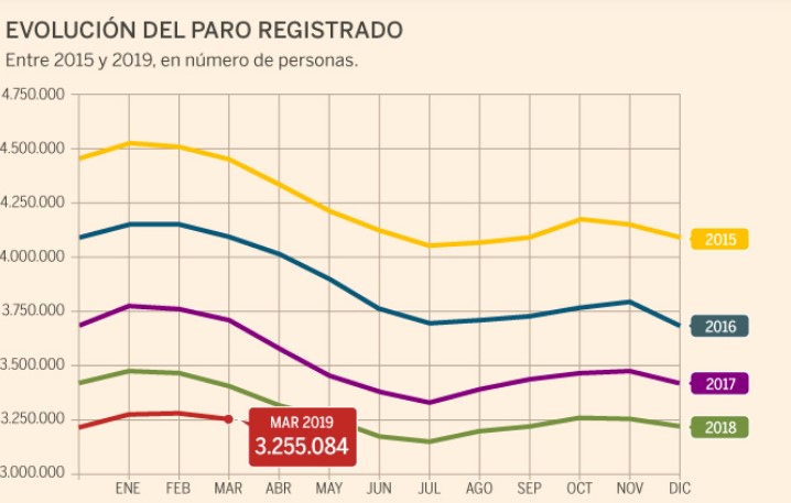 По итогам марта 2019 года число безработных, официально зарегистрированных в органах государственной службы занятости Испании, составило 3.255.084 человека, что на 33.956 человек или на 1,03% меньше, по сравнению с предыдущим месяцем.