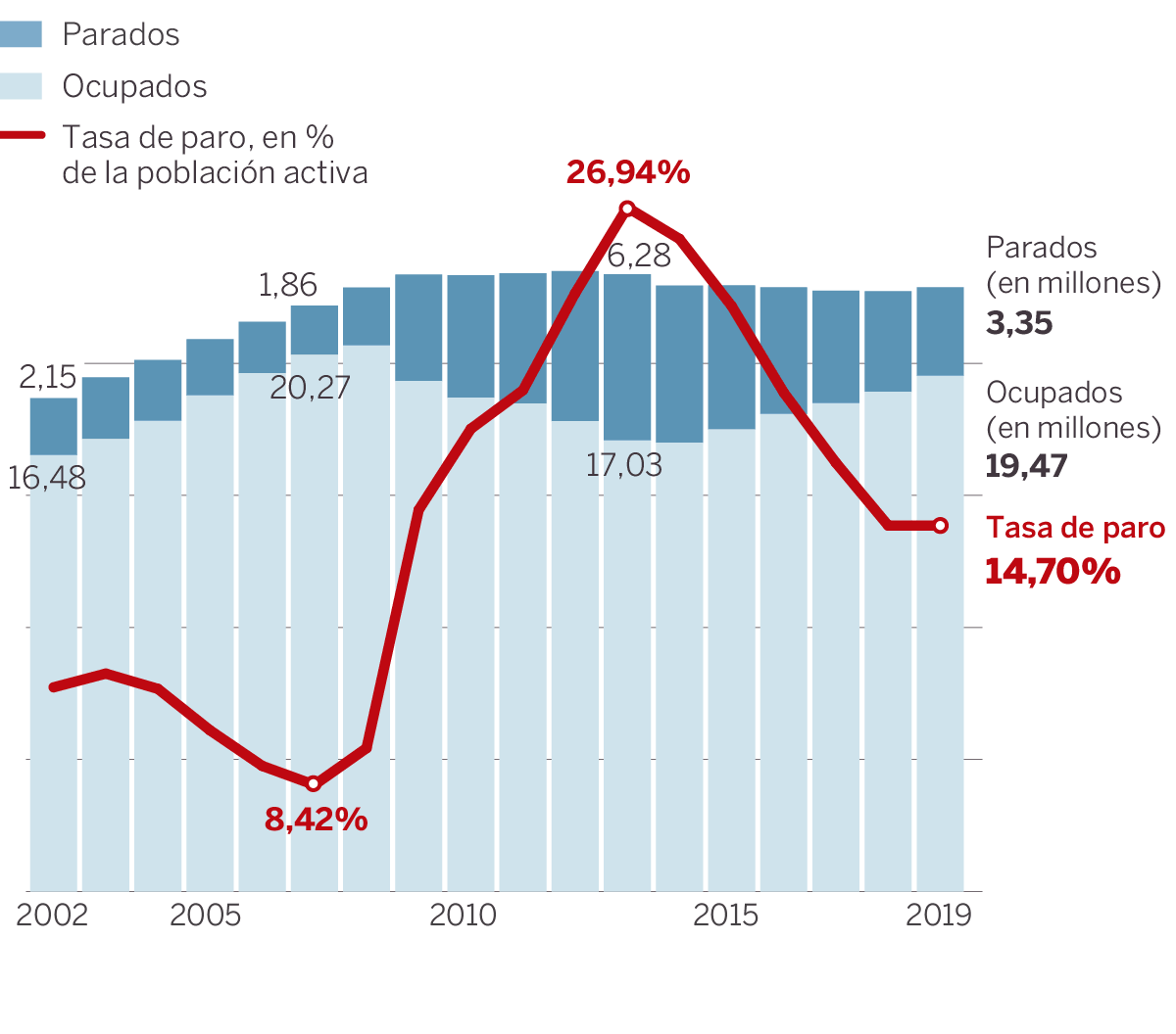 В первом квартале текущего года количество безработных в Испании увеличилось по сравнению с предыдущим кварталом на 49.900 человек (1,51%) и составило в общей сложности 3.354.200 человек. Об этом свидетельствуют данные по безработице I квартала 2019 года, опубликованные сегодня Национальным институтом статистики (INE) согласно обследованию экономически активного населения (EPA).