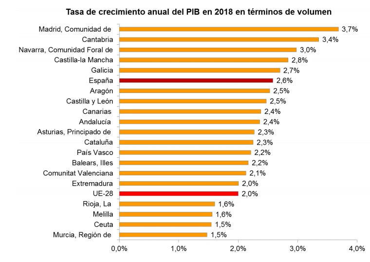 Двенадцать других автономий и вышеупомянутые автономные города достигли увеличения своих экономик ниже, чем в среднем по стране. Так, Арагон зарегистрировал увеличение ВВП на 2,5%, так же, как Кастилия и Леон; Канарские острова и Андалусия достигли увеличения на 2,4%; Княжество Астурия и Каталония выросли на 2,3%; Страна Басков и Балеарские острова достигли 2,2%; Валенсийское сообщество выросло на 2,1%; Эстремадура – на 2%; и Ла Риоха получил рост на 1,6%.Это автономное сообщество, наряду с Мурсией, Сеутой и Мелильей, выросли ниже среднего показателя по Европейскому союзу, который составлял 2%.