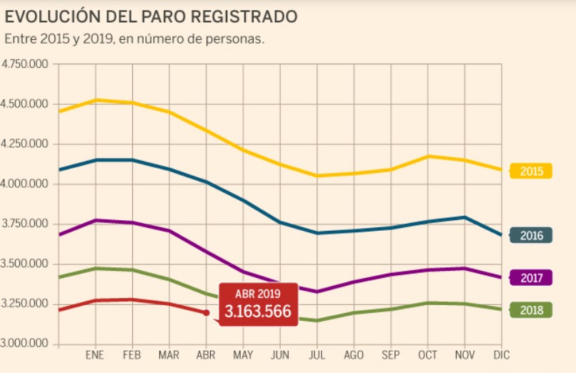 Пасхальная неделя, которая выпала в этом году на апрель, дала небольшой толчок созданию рабочих мест в испанской экономике. По итогам апреля 2019 года число безработных, официально зарегистрированных в органах государственной службы занятости Испании, составило 3.163.566 человек, что на 91.518 человека или на 2,81%, меньше, по сравнению с предыдущим месяцем.