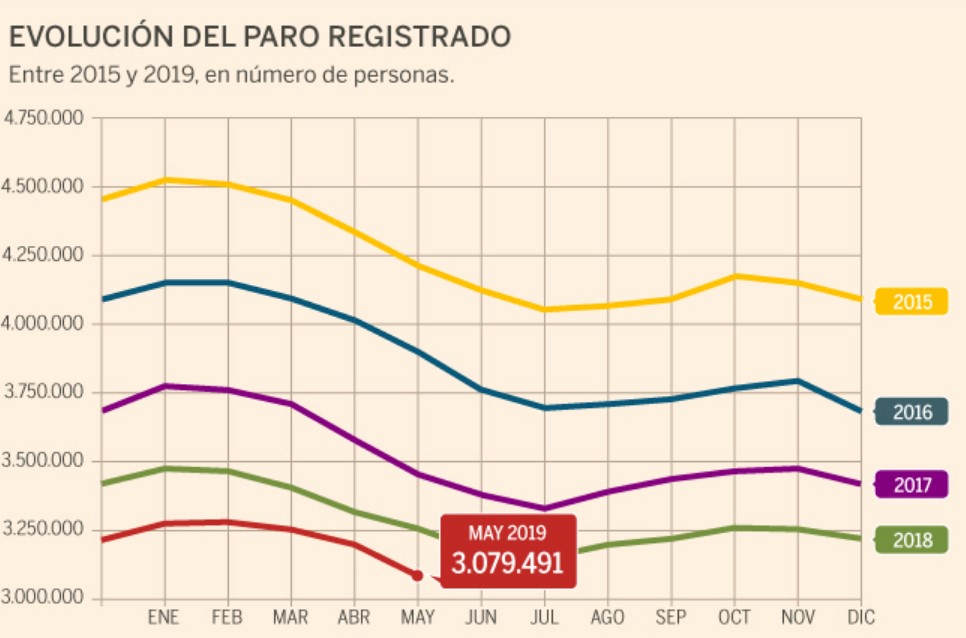 По итогам мая 2019 года число безработных, официально зарегистрированных в органах Государственной службы занятости Испании (SEPE), составило 3.079.491 человек, что на 84.075 человек или на 2,66%, меньше, по сравнению с предыдущим месяцем.