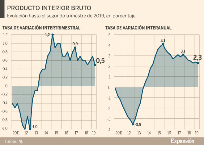 Согласно предварительным данным, опубликованным в сегодня Национальным институтом статистики (INE), во втором квартале 2019 года экономика Испании выросла в квартальном выражении на 0,5%, что на две десятых меньше, чем в первом квартале. В годовом выражении рост ВВП королевства сократился за квартал на одну десятую, до 2,3%, что является самым низким показателем с четвёртого квартала 2014 года.