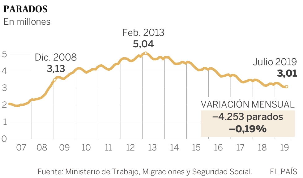 По итогам июля 2019 года число безработных, официально зарегистрированных в органах государственной службы занятости Испании (SEPE), стало самым низким с ноября 2008 года и составило 3.011.433 человека, согласно данным, опубликованным сегодня Министерством труда, миграции и социального обеспечения Испании.