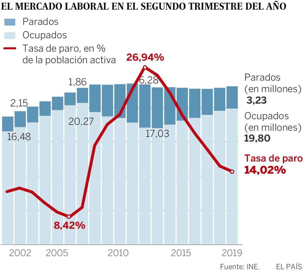 Рынок труда в Испании отмечает первые признаки замедления активности, о чём свидетельствуют последние данные по безработице II квартала 2019 года, опубликованные Национальным институтом статистики (INE) согласно обследованию экономически активного населения (EPA).