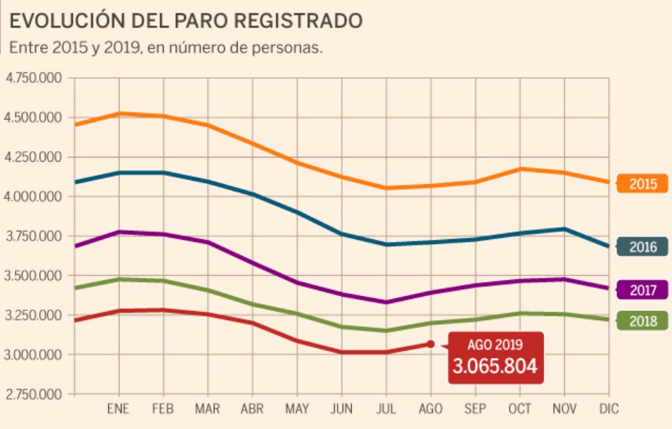 Количество безработных, зарегистрированных в офисах государственных служб занятости Испании на конец августа 2019 года, увеличилось на 54.371 человек и составило в общей сложности 3.065.804 человека. Это был первый рост после шести месяцев последовательного падения, и он оказался самым высоким для августа с 2010 года, когда число безработных увеличилось на 61.083 человека.