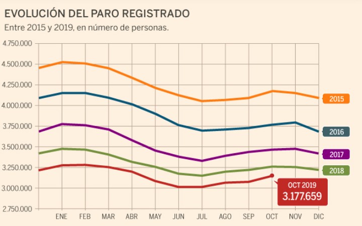 Общее число людей, не имеющих работу, составило на конец октября текущего года 3.177.659 человек. При этом Министерство отмечает, что показатель безработицы имеет самую низкую величину для этого месяца с октября 2008 года. В период кризиса число людей, зарегистрированных на бирже труда, превышало пять миллионов с максимальным значением в феврале 2013 года – 5.040.222 безработных.