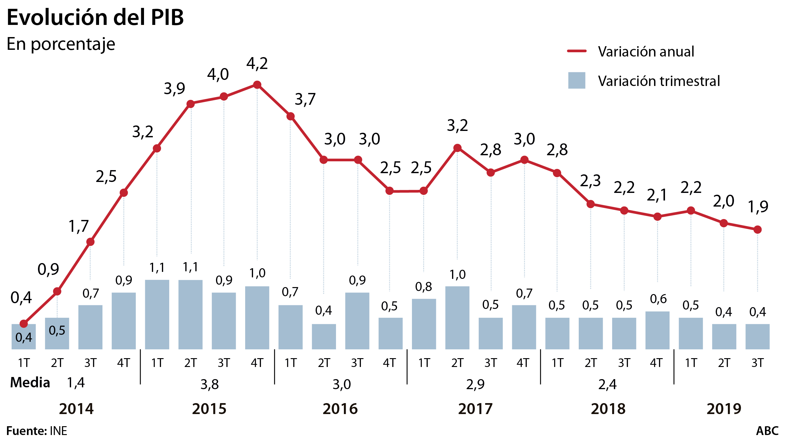 Экономика Испании выросла на 0,4% в третьем квартале 2019 года, так же, как и в предыдущем квартале, согласно окончательным данным Национального учета, опубликованным сегодня Национальным институтом статистики. (INE). Указанный квартальный рост является самым низким за последние три года.